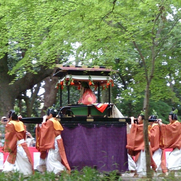 A ritual performed to call and welcome the divine spirit to watch over the festivities and ceremonies on the 15th. The priests and others participants in the ceremony gather for a purification ritual at Shimogamo Shrine. There are a few events to prepare for that day’s ceremony before the procession begins and heads for Mikage Shrinein the forest of Mt. Hiei. In the past, they would walk the entire way to the shrine, but these days the procession only goes halfway through tadasu-no-mori before taking a chartered bus to Mt. Hiei.